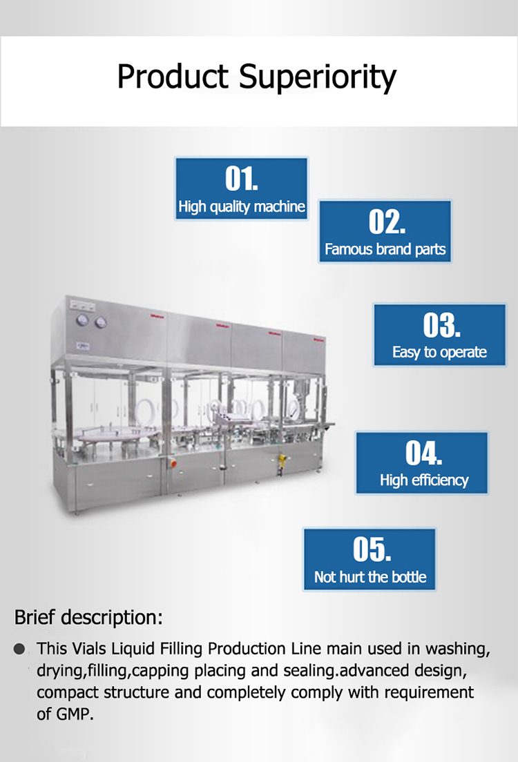 Il-linja ta 'produzzjoni tikkonsisti ultrasoniku magni tal-ħasil flixkun,烘箱温度għolja, il-veloċità għolja mili u magni stoppering u għatu滚动partijiet machine。所有huma konnessi mill-qrib, l-operazzjoni huwa sigur, stabbli u effiċjenti, u s-sett sħiħ ta' jikkonforma tagħmir għall-internazzjonali standard farmaċewtiċi GMP。