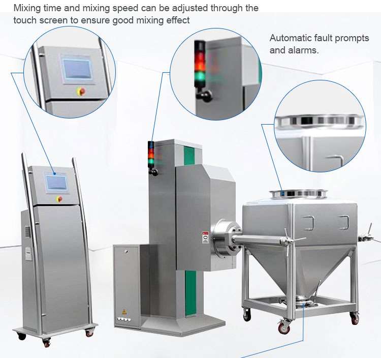 本機主要用於製藥企業固體製劑生產中固體顆粒與粉劑、顆粒與顆粒、粉劑與粉劑等物料的混合。具有混合批量大、受力好、運行穩定、價格實惠等優點,混合均勻度高,料斗可移動,裝料、混合、卸料、清洗方便